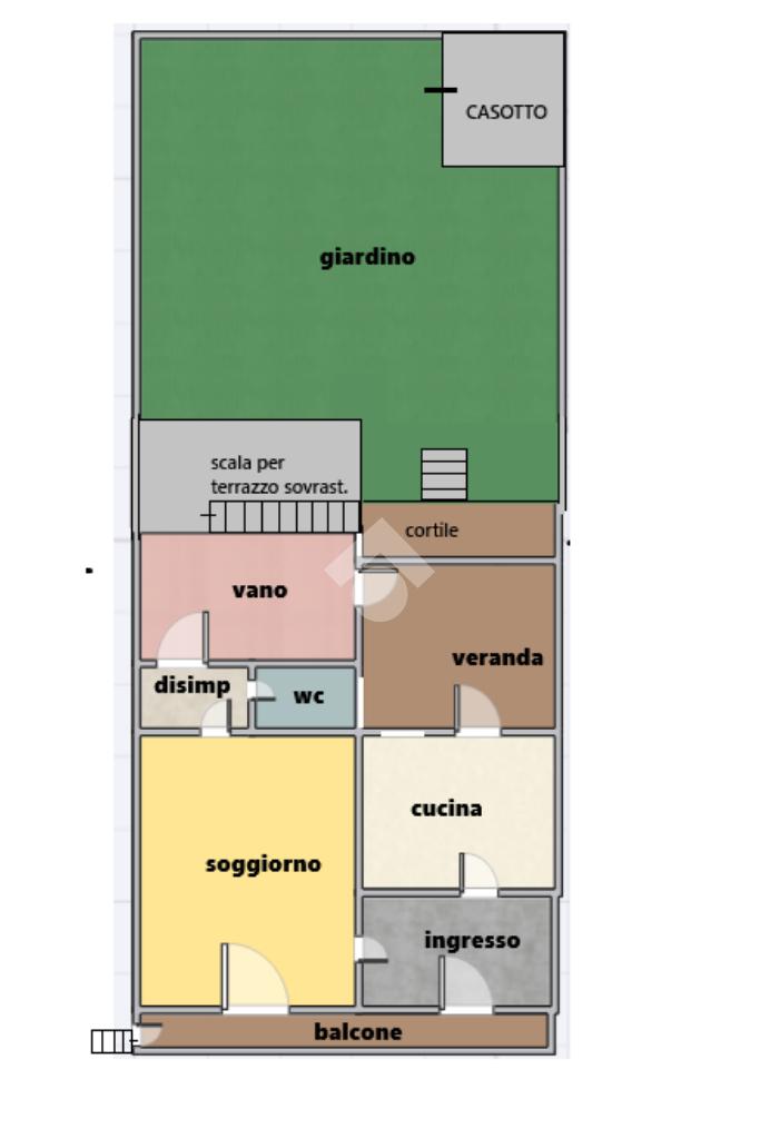 L'immobile: Casa indipendente, rialzata dalla strada, due gli ingressi, uno su una zona disimpegno collegata alla cucina, l'altra sul soggiorno, in sequenza un disimpegno che separa il bagno da un'altra camera da letto, da questa camera è presente un'uscita sul cortile verandato. Anche dalla cucina è presente un accesso alla veranda. Le condizioni della casa sono discrete, da pochi anni è stato rifatto il tetto, parte del terrazzo e della scala per accedervi. Restano da rifare gli impianti elettrico e idrico e gli infissi sono in legno monovetro. La pavimentazione è in ceramica in tutti gli ambienti, prevalentemente bianca monocolore, nella camera da letto i pavimenti sono con decoro tipico degli anni '70. Oltre la veranda, sono presenti circa 190 mq di spazio esterno suddivisi tra terrazzo sovrastante e giardino su terrazzamenti, su uno dei quali è presente un ulivo, spazi ottimi per realizzare un piccolo orto.