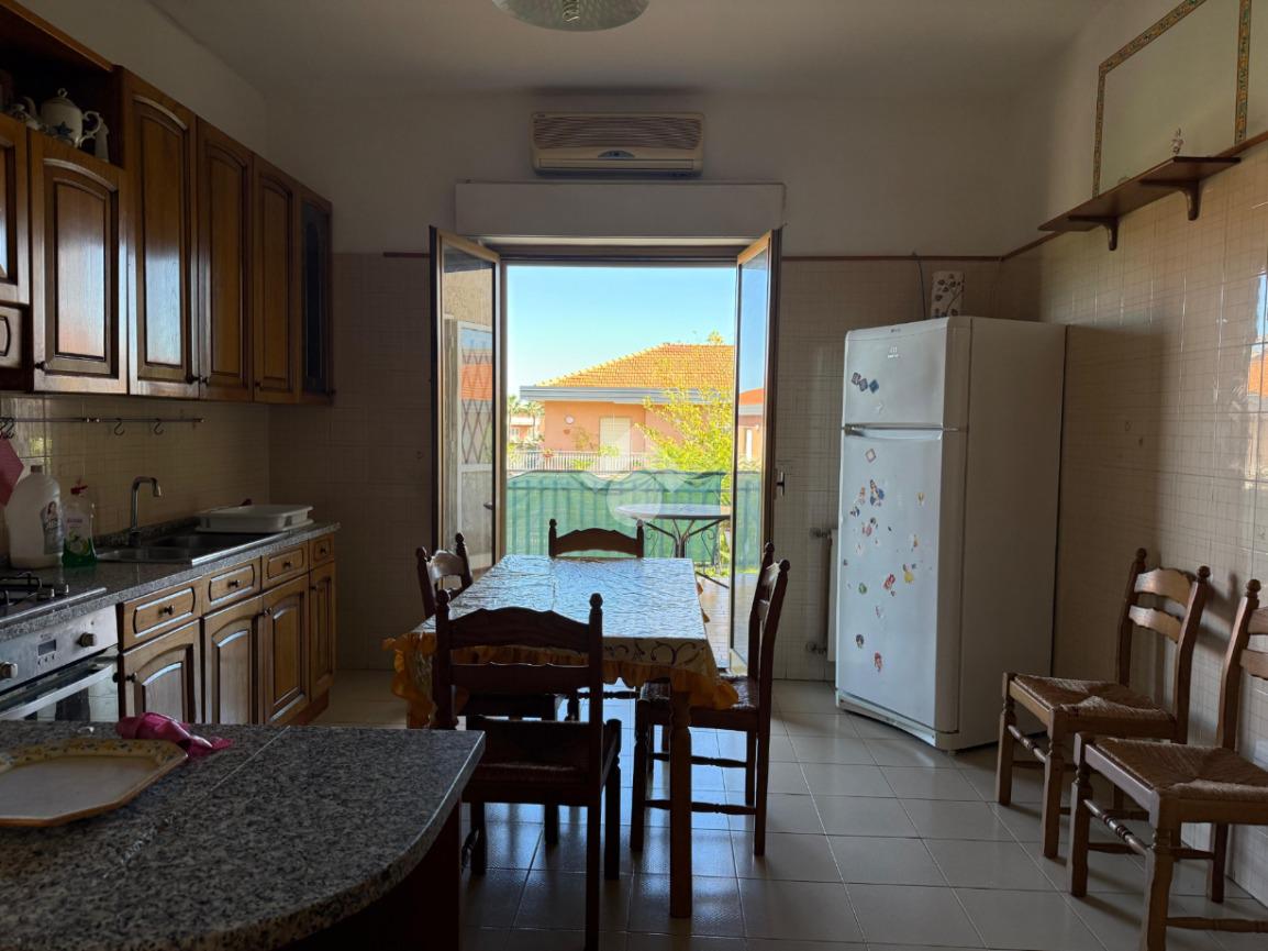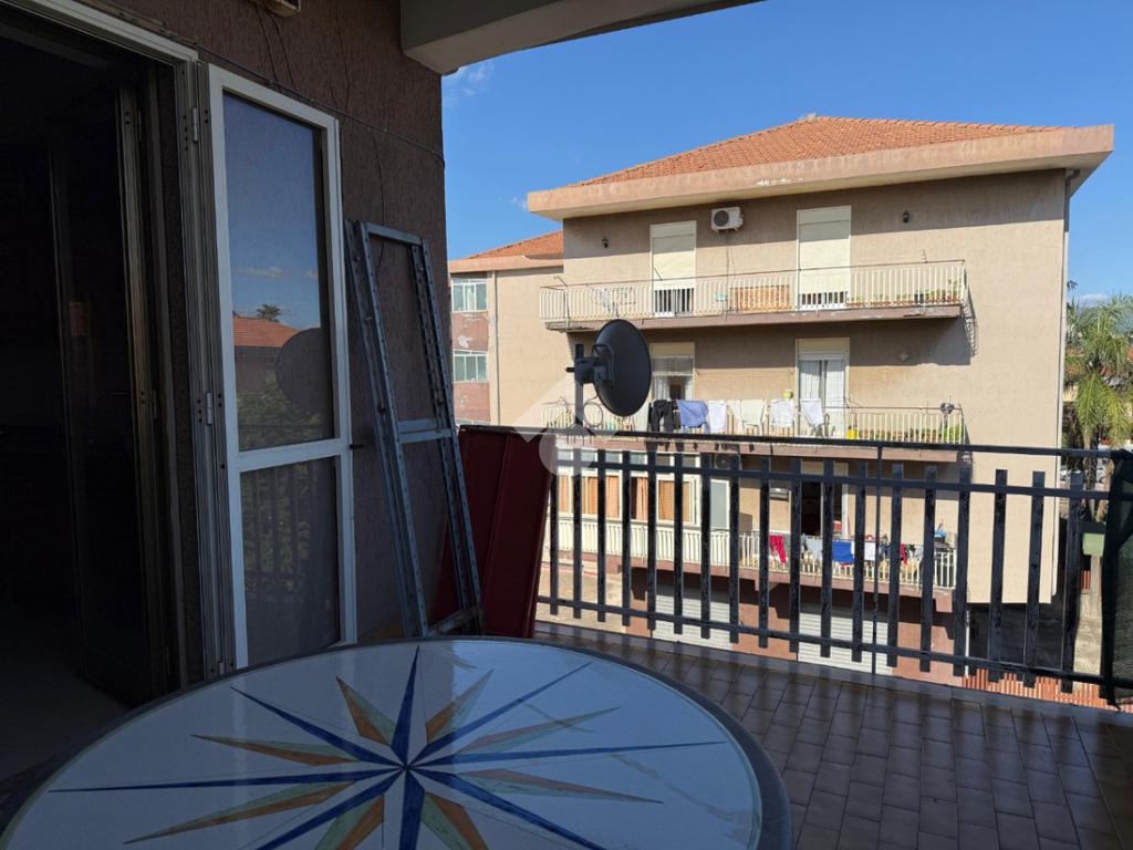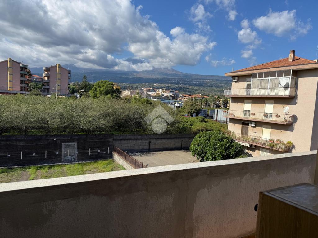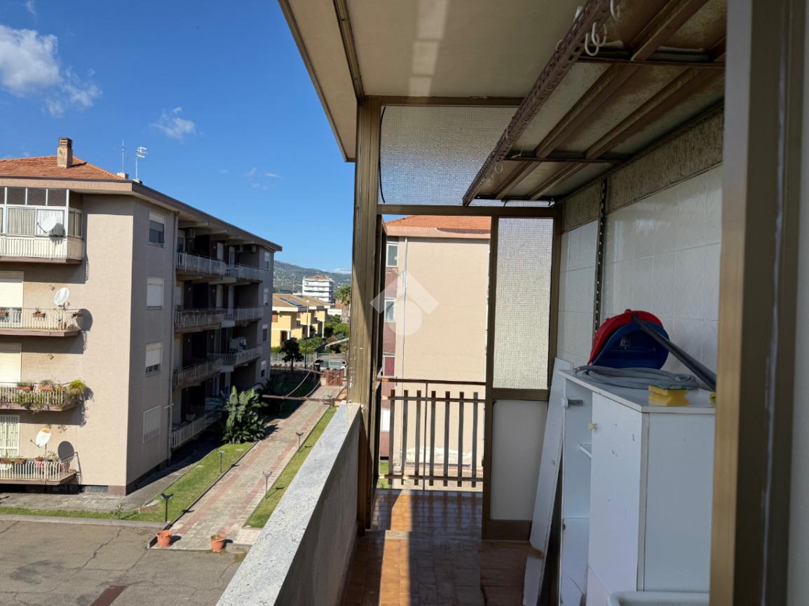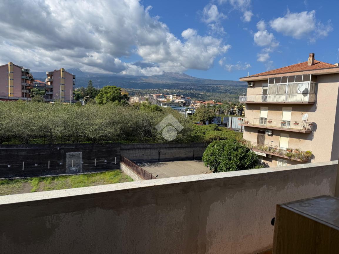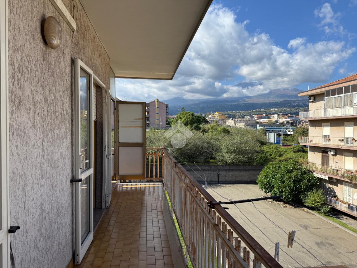 L'appartamento: al secondo piano ascensorato, l'ingresso è su disimpegno che divide la cucina dal soggiorno, entrambe hanno affaccio su terrazzo a livello di mq 13 esposto ad Est, con vista mare. Ulteriori tre vani ed il bagno a completare gli spazi interni dell'immobile disimpegnati da un corridoio. Un balcone a giro abbraccia il resto degli ambienti, con vista Etna, esposto a Nord ed Ovest, in parte verandato adibito attualmente a lavanderia. L'immobile si presenta in buone condizioni, necessari solo alcuni interventi di rimodernamento. Gli impianti sono originari del'epoca di costruzione, gli infissi in alluminio monovetro, riscaldamenton autonomo. Incluso nella vendita un garage di mq 25.