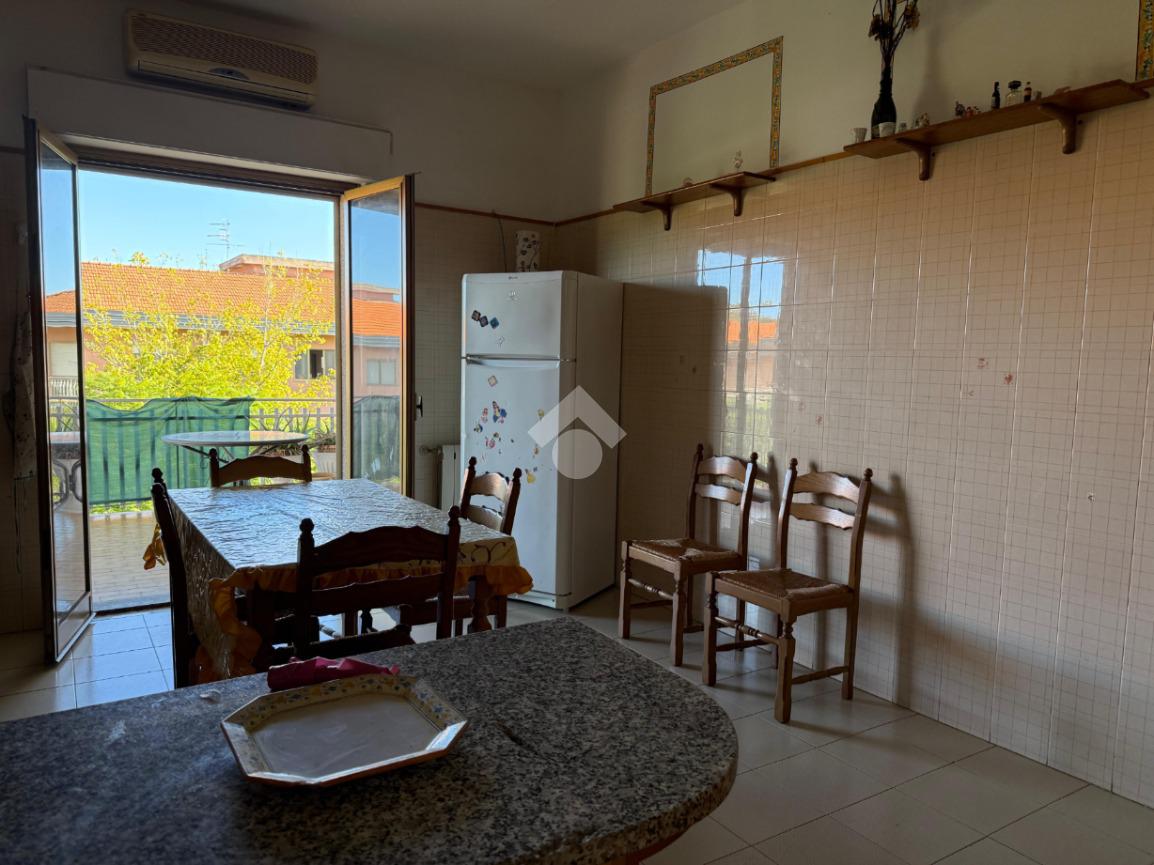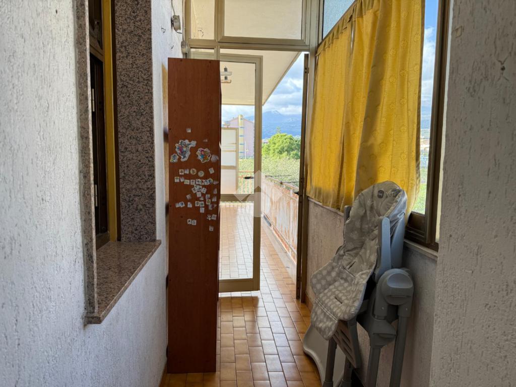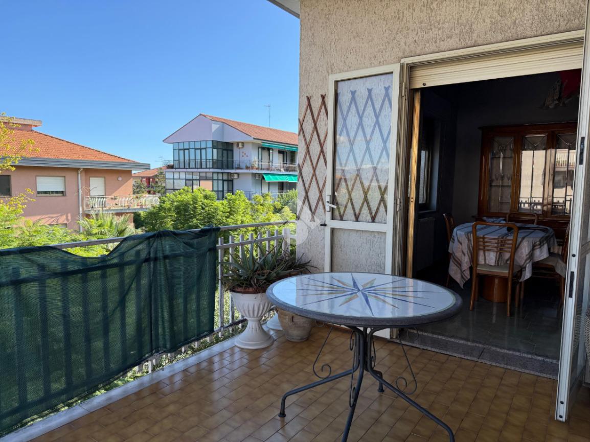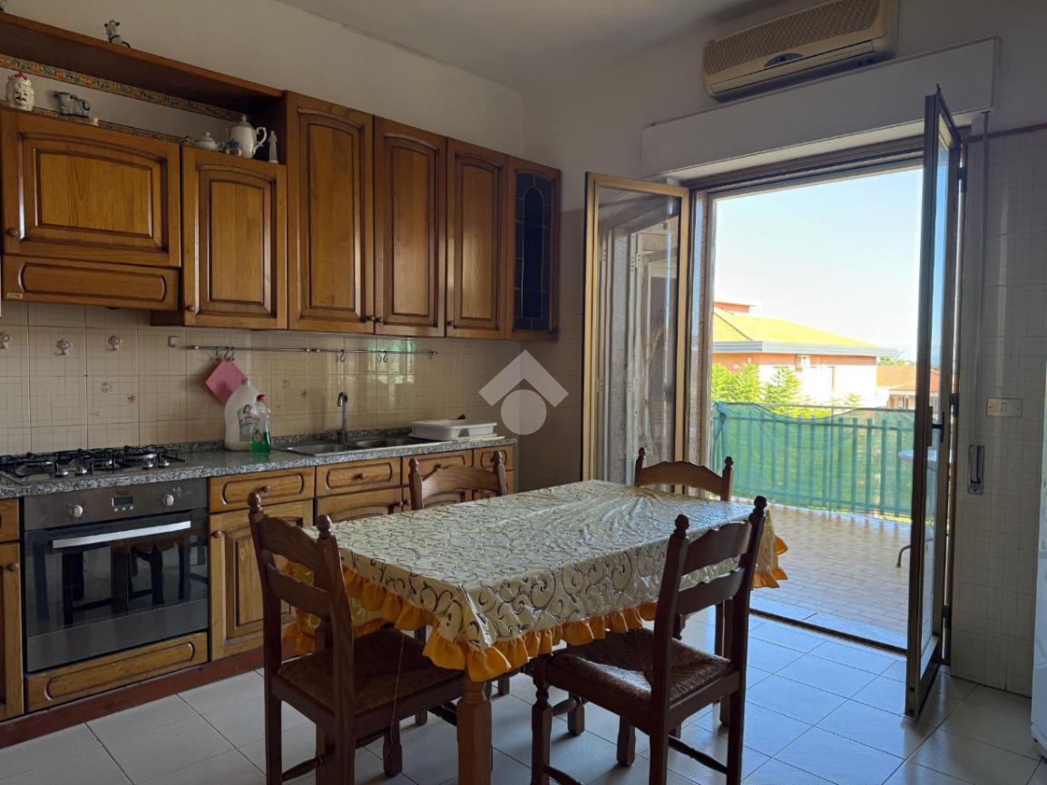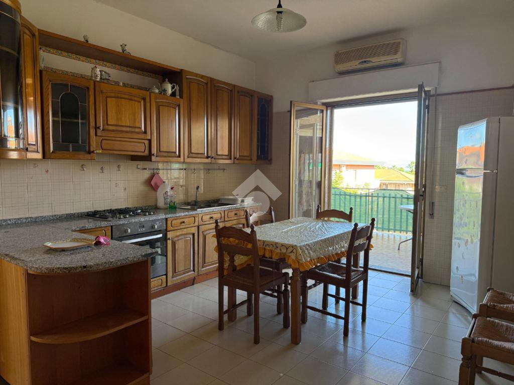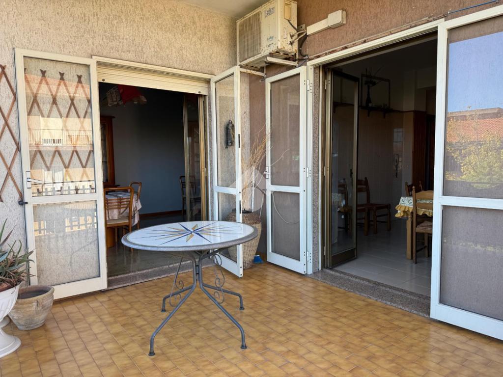 L'appartamento: al secondo piano ascensorato, l'ingresso è su disimpegno che divide la cucina dal soggiorno, entrambe hanno affaccio su terrazzo a livello di mq 13 esposto ad Est, con vista mare. Ulteriori tre vani ed il bagno a completare gli spazi interni dell'immobile disimpegnati da un corridoio. Un balcone a giro abbraccia il resto degli ambienti, con vista Etna, esposto a Nord ed Ovest, in parte verandato adibito attualmente a lavanderia. L'immobile si presenta in buone condizioni, necessari solo alcuni interventi di rimodernamento. Gli impianti sono originari del'epoca di costruzione, gli infissi in alluminio monovetro, riscaldamenton autonomo. Incluso nella vendita un garage di mq 25.