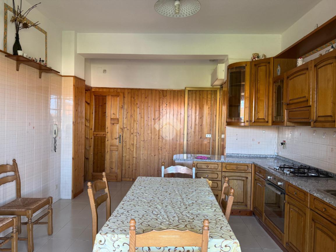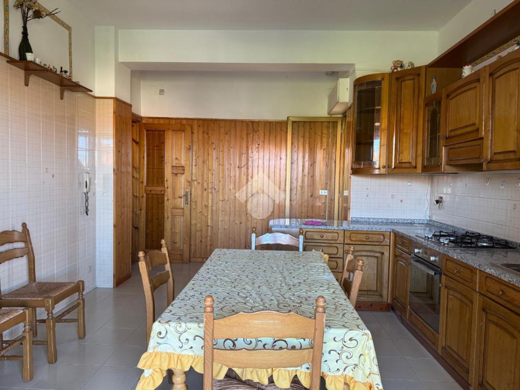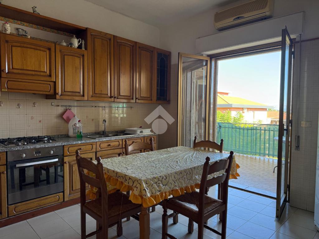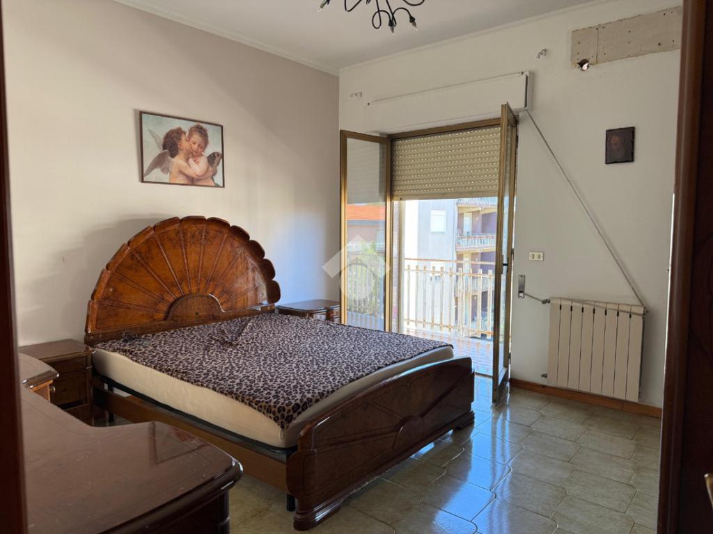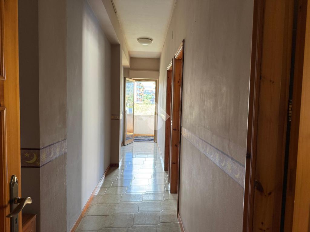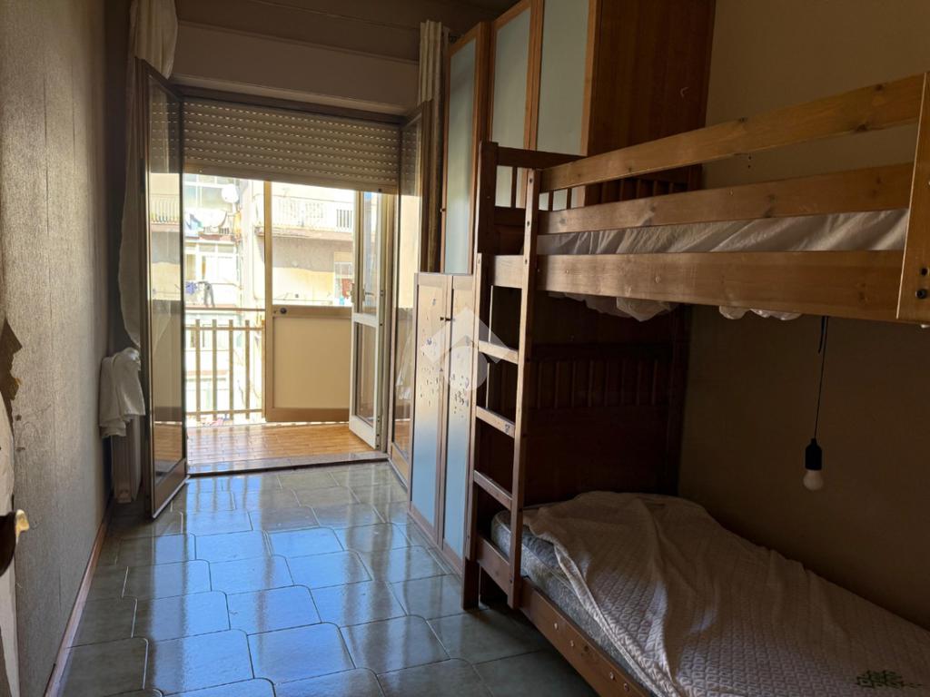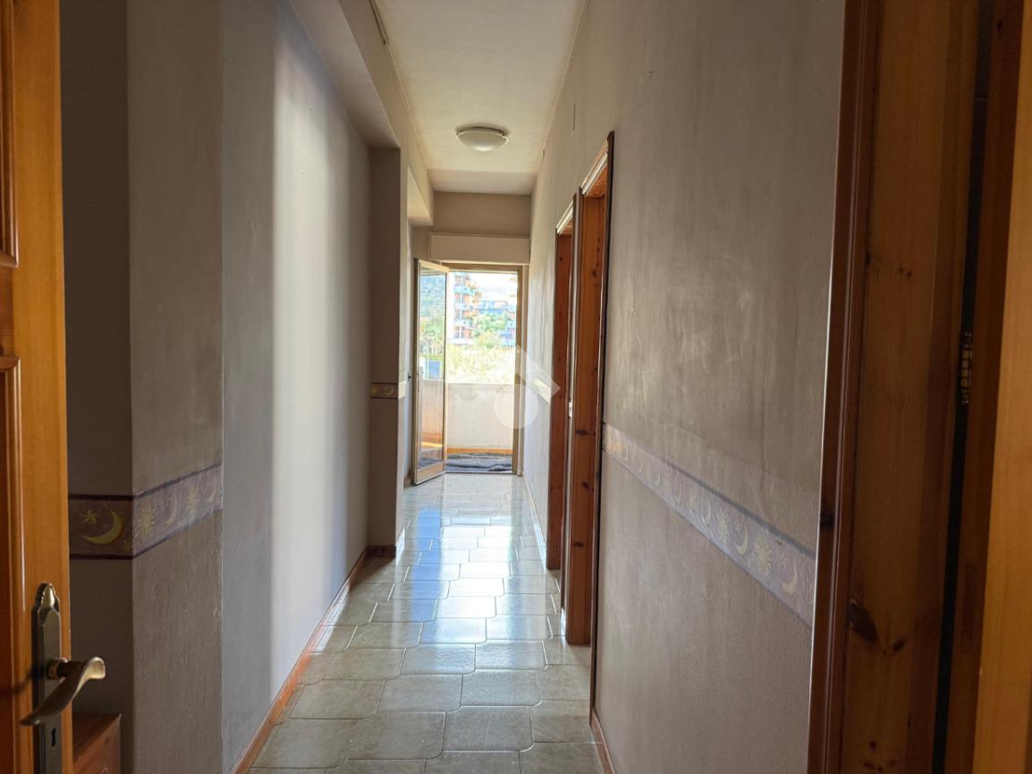 L'appartamento: al secondo piano ascensorato, l'ingresso è su disimpegno che divide la cucina dal soggiorno, entrambe hanno affaccio su terrazzo a livello di mq 13 esposto ad Est, con vista mare. Ulteriori tre vani ed il bagno a completare gli spazi interni dell'immobile disimpegnati da un corridoio. Un balcone a giro abbraccia il resto degli ambienti, con vista Etna, esposto a Nord ed Ovest, in parte verandato adibito attualmente a lavanderia. L'immobile si presenta in buone condizioni, necessari solo alcuni interventi di rimodernamento. Gli impianti sono originari del'epoca di costruzione, gli infissi in alluminio monovetro, riscaldamenton autonomo. Incluso nella vendita un garage di mq 25.